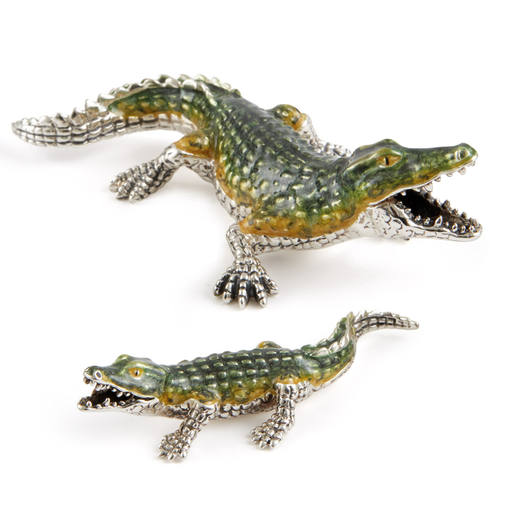 Our crocodile couple has been brought to life in silver by the artisans at Saturno. The attention to detail is incredible from its scaly skin and webbed feet, to its long pointed snout and tail, it even has a set of sharp looking teeth! The green and yellow enamelling are a great addition and the couple can be supplied individually if required. Each piece has been lacquered which removes the need for cleaning with silver products, so a wipe with a soft cloth will suffice. Full UK hallmarks have been applied, which is your guarantee that the item is made in sterling silver. The silver and enamel crocodiles are supplied in a luxurious gift box and make for truly unique gifts.
