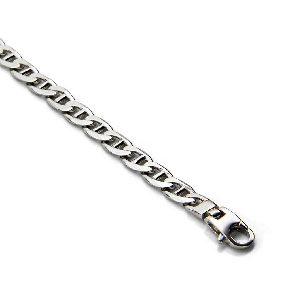 The 6mm wide Crossbar bracelet looks great either worn on its own, or combined with other bracelets. The piece is hallmarked in the UK and has been rhodium plated to prevent tarnishing.