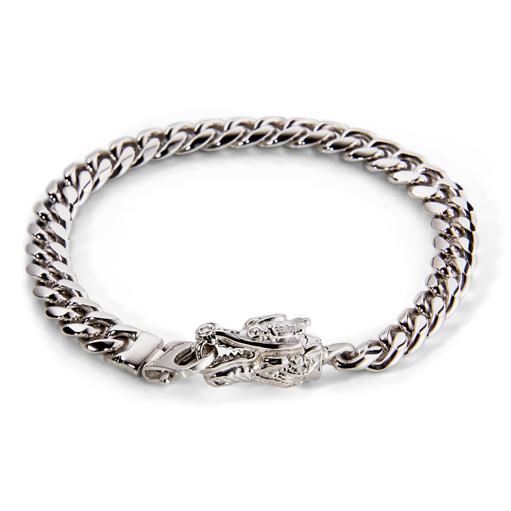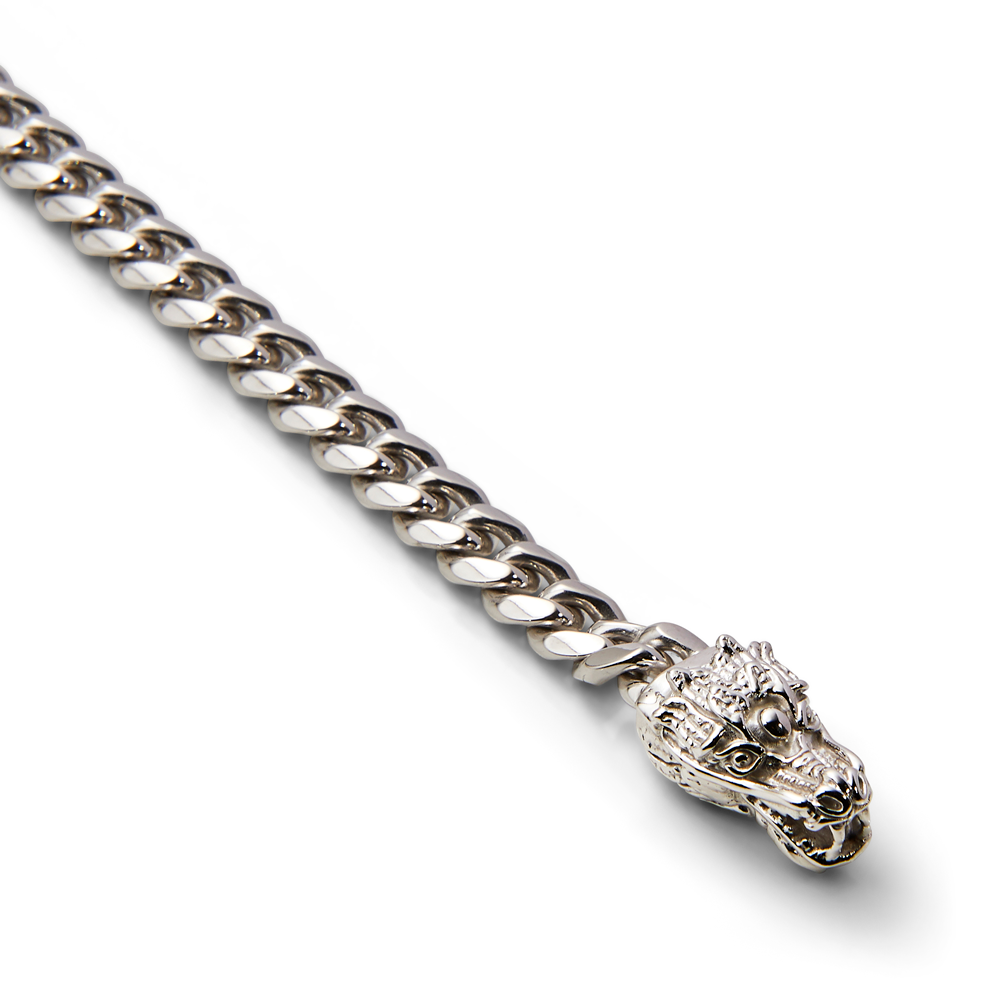 Our Dragon head bracelet, is a unique design and incredible quality. Made in sterling silver and carrying full English hallmarks, the bracelet has been rhodium plated to prevent tarnishing.