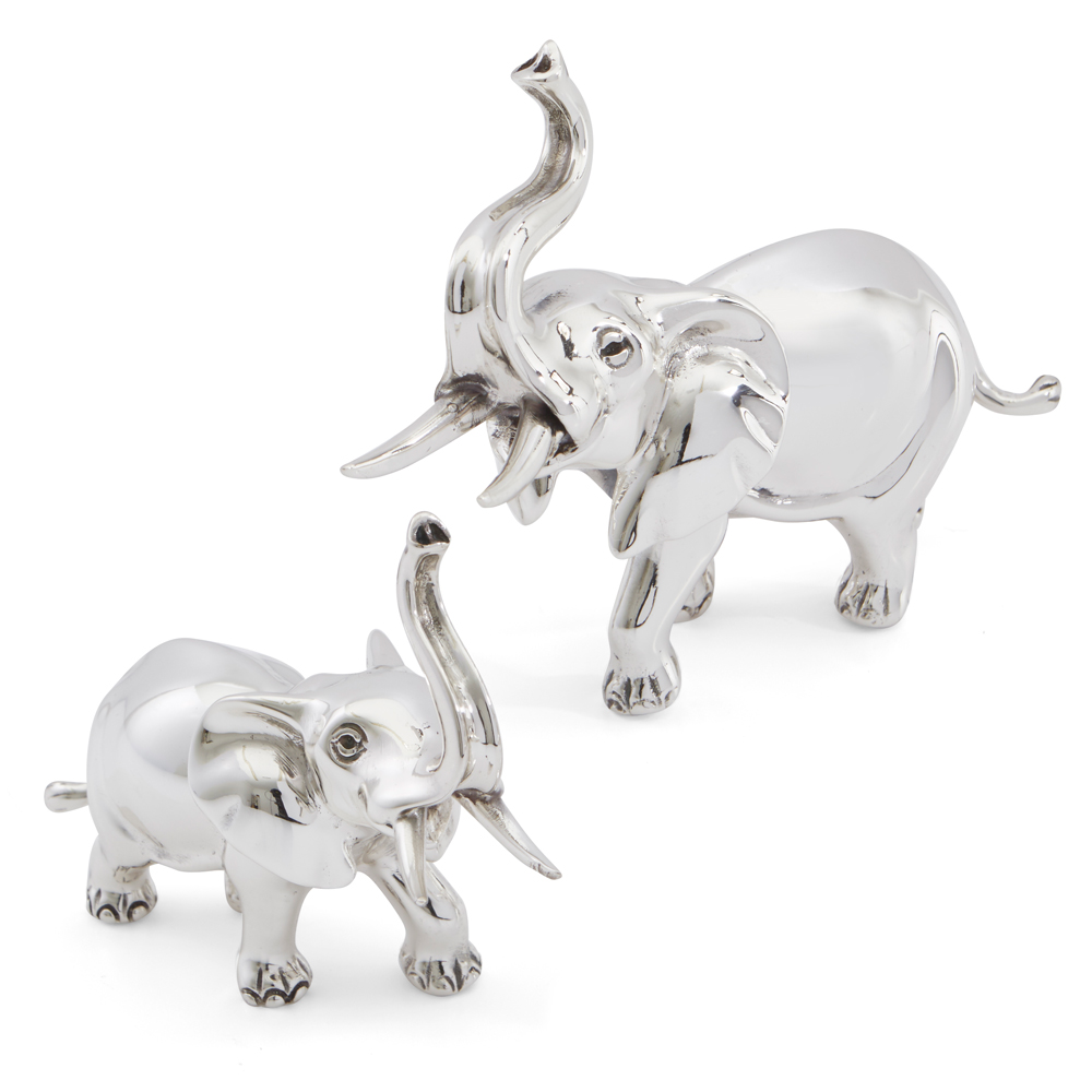 This wonderful silver elephant couple has been crafted by the artisans of Saturno. The elephants are modelled with their trunks raised, which they would characteristically do when greeting friends or expressing happiness. These are sterling silver models of the highest order, with mirror polished silver bodies and a good weight of silver. The elephants are lacquered to prevent tarnishing and a regular clean with a soft cloth is all that is needed to keep the elephants looking shiny. Each item carries a full UK hallmark and is presented in a smart gift box.