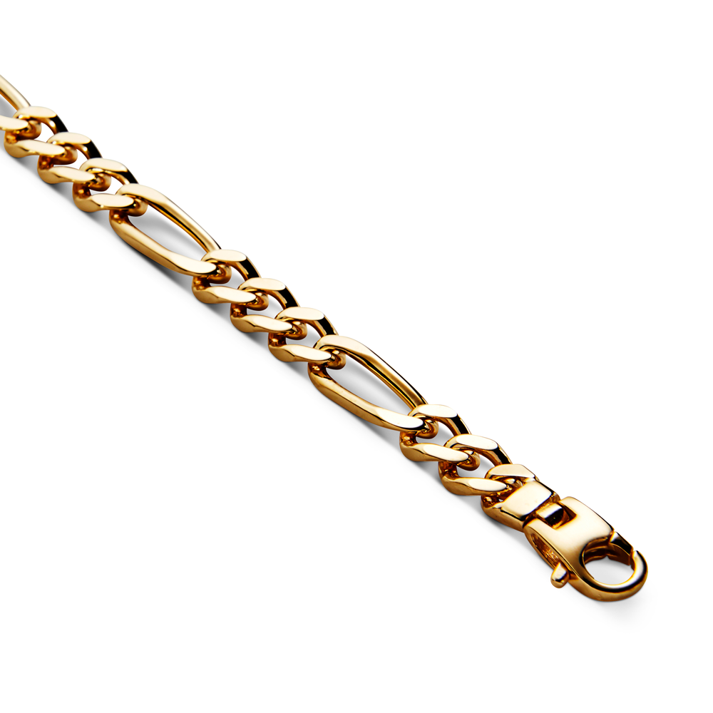 The beautiful figaro chain, embellished by 24ct pure gold plate on sterling silver by Saturno. The bracelet is completely hand made and is hallmarked in the UK.