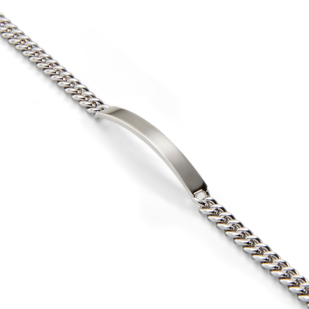 The on trend Groumette curb i.d. bracelet is handmade and hand finished by the artisans of Saturno. The bracelet is hallmarked in the UK and has been rhodium plated to prevent the silver from tarnishing.