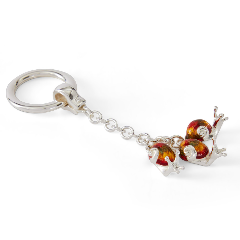This trio of snails in the form of a silver key ring would make a highly unusual gift. The enamelled colours on the snails shell contrasts beautifully against the polished sterling silver surface. The item is hallmarked at a UK assay office and is supplied in a signature gift box.