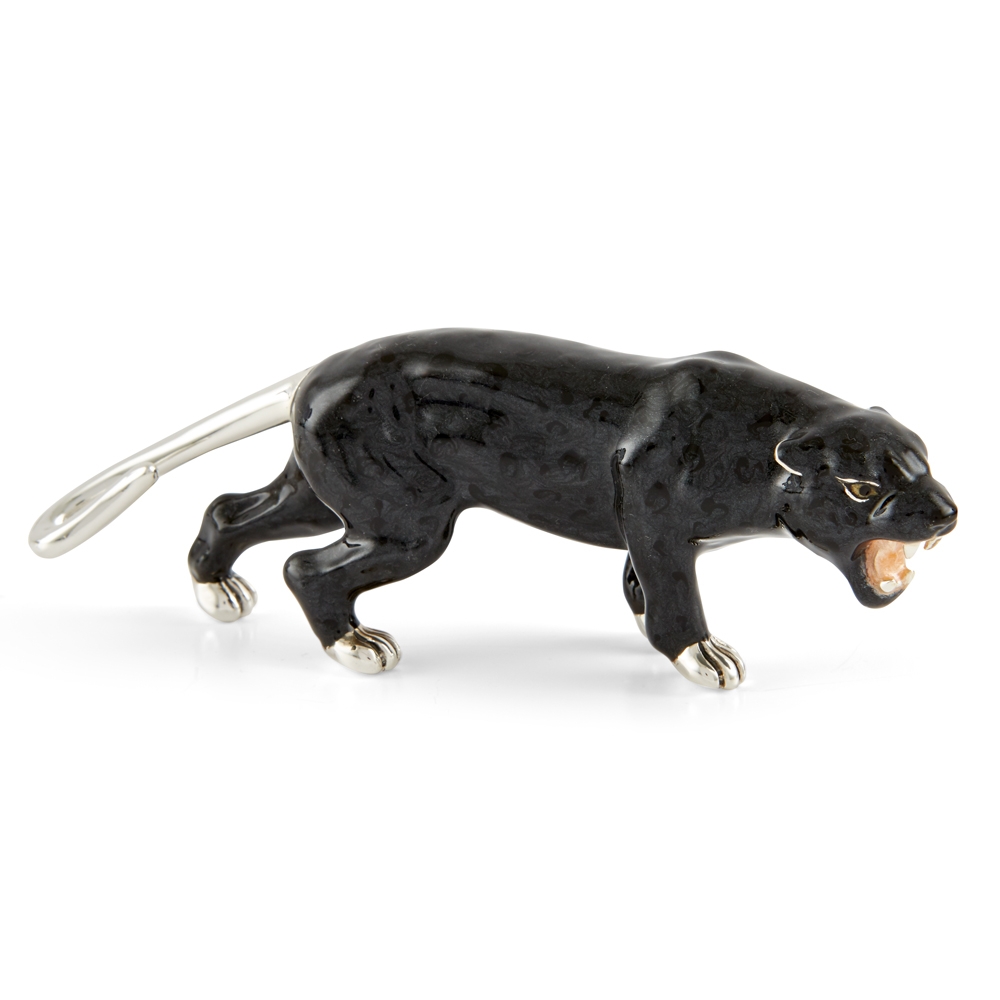 The artisans of Saturno have brought to life this amazing black panther, an elusive and powerful animal, which is very seldom seen by humans. The model features a panthers bright eyes, strong jaw and famous black coat, which makes it almost invisible in the darkness of night. This item is hand made in Italy with breath-taking attention to detail and would make a fabulous gift. The panther is hallmarked in the UK, which guarantees the item as being made in sterling silver. It is presented in a luxurious gift box.