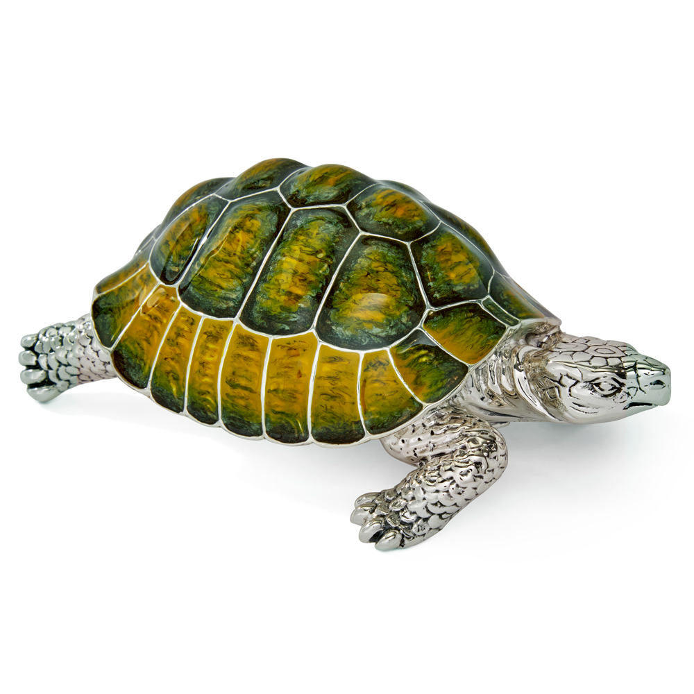 This large Saturno turtle is a truly beautiful model. The turtle has been brought to life by the artisans at Saturno, possibly the only company in the world who is capable of this level of craftsmanship. From the initial moulding through to the casting and hand polishing, the care and attention to detail is second to none. The shell of the turtle has been hand painted in various shades of green, with the head and flippers in plain silver with eye catching scaly skin detailing. The final stage of manufacturing is the lacquering process, this helps protect the piece from tarnishing, this then removes the need for cleaning with silver cleaning products. From time to time wipe with a soft cloth, to keep the turtle in pristine condition.